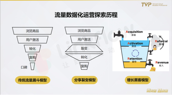 对于流量数据化的运营探索历程,盛马丁老师也举了三个例子:从传统流量漏斗模型到分享裂变模型再到现在流行的增长黑客模型。