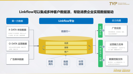 盛马丁老师介绍了Linkflow的数字化转型框架,通过构建数据基础及强有力的数据中台,帮助客户从流程驱动升级为数据驱动。他指出,这其中的三大关键点分别是:构建数据池、标准、规范化快速响应、一切效果可溯源。具体框架如下所示: