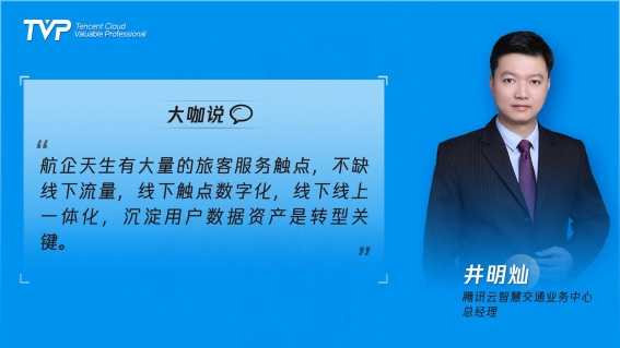 腾讯云智慧交通业务总经理井明灿老师在当前疫情下看到了民航业转型的历史机遇,他指出,传统行业如民航业有天生的一大优点:不缺用户流量。整个民航业从销售到旅客行程中有无数个接触点,线下、线上场景的旅客数量都是上亿级别。这是航司数字化转型的天然资源优势。