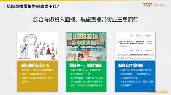 第一,目标客群定位不准。航空出行产品的目标客群与零售电商的目标客群有较大差异;直播受众主要受主播吸引,而非产品吸引;