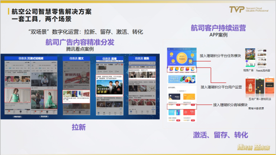 腾讯在互联网行业耕耘20年已经积累有非常丰富的流量、营销、技术资源,基本思路都是从一个开放、连接的角度,以新的视角看待行业。航企在疫情当下,实名制、小程序、健康码可以让用户精准转化为私域流量。航企需要一个完整的运营平台去运营精准的用户,腾讯云提供了一个完整的航空公司智慧零售解决方案,一套工具,两个场景,帮助航司打通从拉新到留存再到激活、转化的全流程。