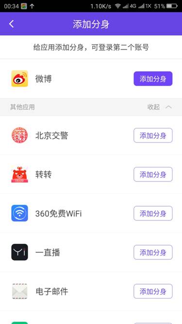 点击“添加分身”后可以看到除了能够给最常用的微信、QQ、微博等高频APP添加分身之外,还可以给手机中的其他APP添加分身,整个过程极为简单快速。对于有多开需求的用户,还提供了分身大师多开版,可以支持多开应用。