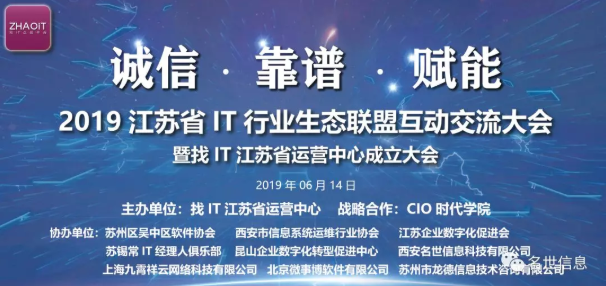 2019年6月14日“2019年江苏省IT行业生态联盟交流互动大会暨找IT江苏省运营中心大会”,在苏州市清山会议酒店隆重召开。