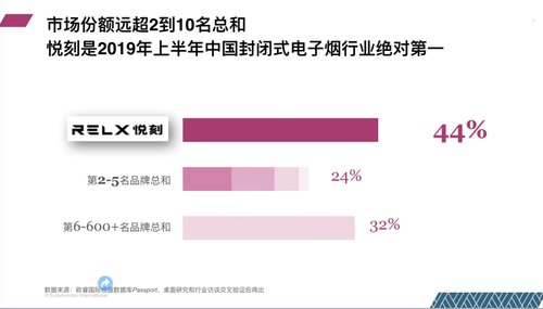 欧睿国际(Euromonitor)的数据显示,中国封闭式电子烟市场的年均复合增速高达到65%,成为近几年消费品行业中最醒目的增长品类。RELX悦刻2019上半年在中国封闭式电子烟行业处于绝对第一的地位,市场份额达44%,远超2-10名的总和。成绩的背后,与RELX悦刻一直在打造的硬实力息息相关。