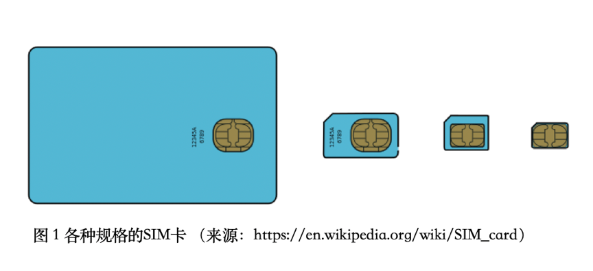SIM卡的物理接口使用智能卡标准接口ISO/IEC 7816,并一直沿用至今。核心是一个集成电路芯片,使用不同大小的封装方式,形态基本保持相同(见图 2)。