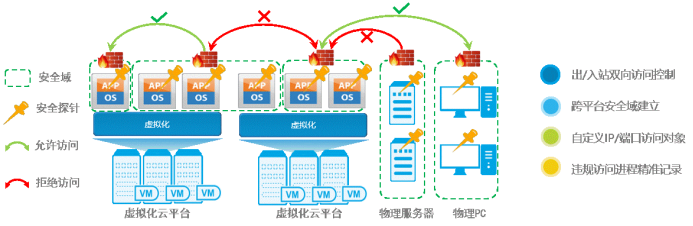 针对安全区域边界,杰思采用轻代理部署方式支持主机微隔离功能,能够实现主机防火墙功能具备主机间访问控制的能力,能够以源目的IP、源目的端口及主机分组的条件进行访问控制,可对网络中区域之间设置访问控制策略和访问控制规则,可根据需求定制通信受控接口细化到具体协议和端口。在各主机中配置主机防火墙,以主机维度定义入站和出站安全访问规则,安全访问规则可基于通信协议、通信对象、通信端口、防护动作多个维度进行定义。可结合对程序应用的分析,呈现主机网络访问关系,并且能呈现发起访问的源及其详细路径,以及其安全性。而且可细化到源地址、目的地址、源端口、目的端口和协议等进检查,同时可设置允许/拒绝访问。