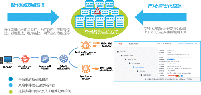 针对安全计算环境,支持威胁事件溯源功能,可检测恶意代码受感染范围主机列表,定位恶意代码传播源头,锁定恶意文件路径并对恶意代码感染行为进行阻断隔离。配合微隔离功能建立安全域隔离已受感染主机,防止在网络内部横向扩散,支持对威胁事件进行多种形式的告警。