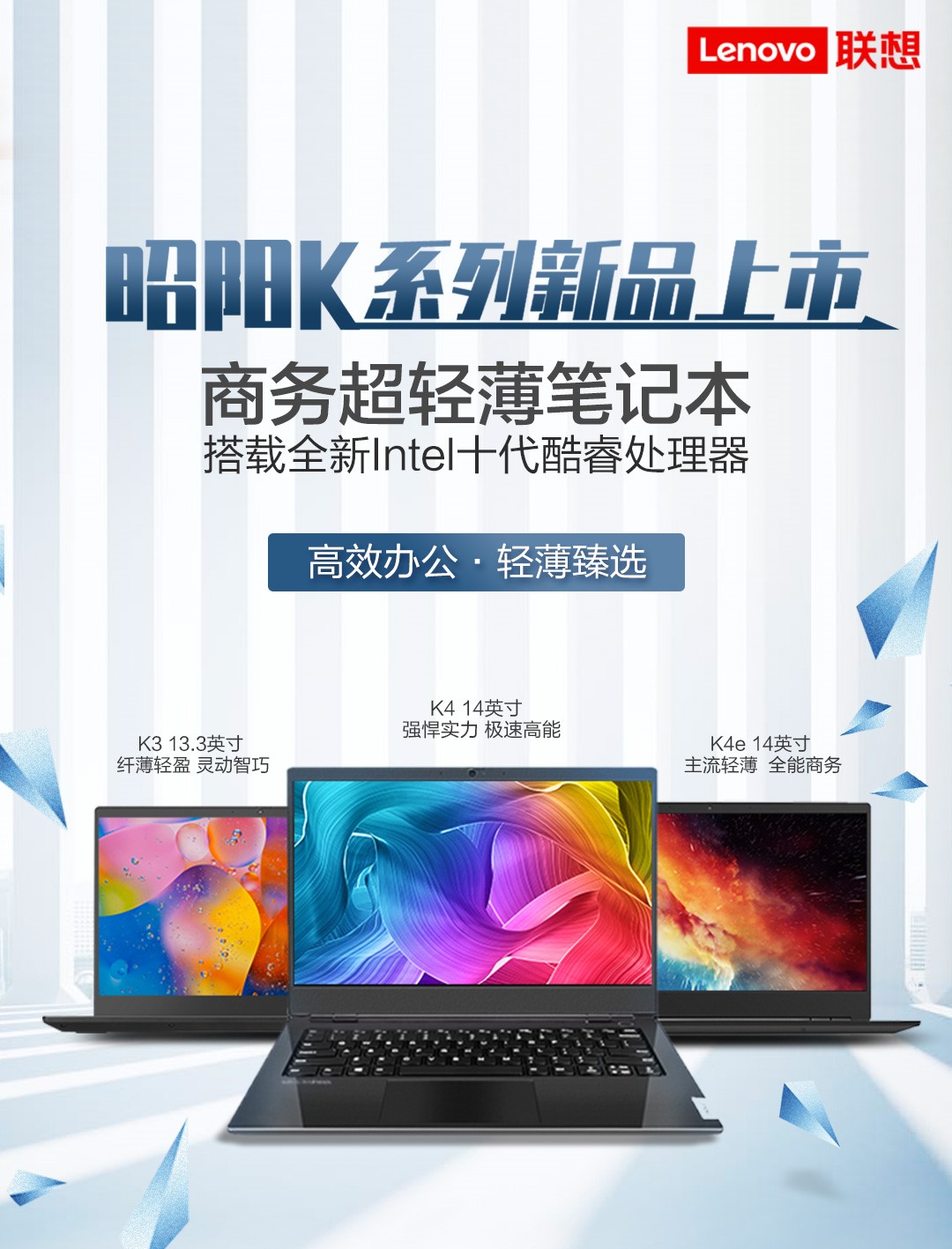 昭阳K中的K代表King,王者。K既是目标也是态度,是把握时机、积极奋斗成为职场王者、业界王者的雄心,更是面对工作上接二连三的挑战,应对自如的王者气概。联想昭阳K新款K4、K3、K4e,均搭载十代英特尔酷睿处理器,支持WiFi 6无线网卡,传输速率高达2400Mbps,无线办公疾速高效,安全防护配置,保护隐私不泄露,经过MTBF 80万小时平均无故障运行测试,180度开合“画轴”式铰链设计,经得起30000次开合。