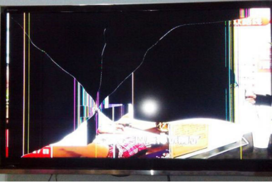 现实中,绝大多数情况是:子弹击中屏幕,屏幕受力不合理、面板支撑不均匀,于是弹孔处玻璃沿着应力碎裂(就像玻璃被打碎那样),液晶分子失去约束、快速泄露,结局如同下图,这也是笔者亲历过的屏幕维修处,几乎所有受损液晶屏幕共同的遭遇。看下面这张图,由于电视内部支撑不够理想,玻璃裂纹几乎贯穿屏幕。