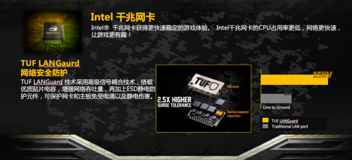 疾速、稳定的网络环境是影响游戏胜率的关键。华硕TUF B365M-PLUS GAMING主板采用Intel千兆网卡,为玩家带来疾速流畅的网络体验。同时配备TUF LANGuard网络安全防护,采用高级信号耦合技术,搭载优质贴片电容,大幅增强网络吞吐量,再辅以ESD静电防护元件,能够保护网卡和主板免受电涌和静电伤害。低延迟、无卡顿的网络体验,可令玩家将精湛操作发挥得淋漓尽致。《黑暗圣徒3》音效一向被玩家称道,授权原声音乐营造出了令人沉醉的自由世界,TUF B365M-PLUS GAMING主板搭载高品质ALC1200 8声道音频芯片,采用高品质日系音频电容,拥有音频屏蔽技术和声道分层隔离设计,给予玩家细腻劲爆的音效输出,提供劲爽游戏音效体验。