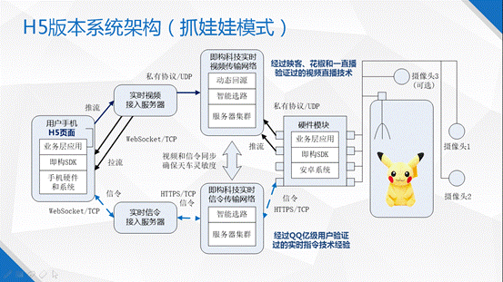 即构在线抓娃娃H5方案平均延迟400ms,逼近原生APP的用户体验。用户可以敏捷操控、精准下爪,体验逼近原生APP。方案采用WebSocket技术,基于UDP的私有传输协议,结合经过验证的直播云端,突破了HLS高延迟的技术限制,同时还能保持H5的传播便捷特性。