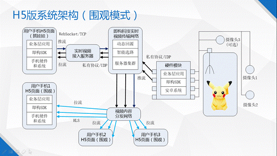 图1、图2分别是即构科技在线抓娃娃H5方案的抓娃娃模式和围观模式的系统架构图。