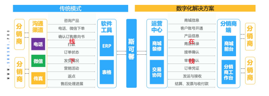 二十余载的发展,不断扩大的市场份额倒逼着斯可馨不得不去思考和实践新的业务模式,在行业产品同质化严重的当下,个性化定制需求成为了许多泛家居企业业务增长的切入点,斯可馨也不例外。但在扩张的过程中,斯可馨也逐步发现了一些业务痛点。“分销商的定制需求沟通主要依靠电话、微信、传真等方式进行下单,商品信息的不规范导致整个下单流程繁琐且易出错,新人培训成本高;营销活动靠线下匹配,校验流程长;订单管理未可视化,查询难度大;财务和业务数据割裂,返款结算依赖手工;售后服务流程不透明,多部门协调效率并不高……“综上问题的暴露,使得如何搭建同分销商、门店之间的高效分销协同体系,提升整体服务能力,打通从订单到对账的全商业链路成为了斯可馨亟待解决的难题。