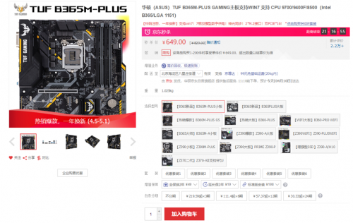 首先为玩家推荐有着高性价比的华硕TUF B365M-PLUS GAMING主板。该主板不仅供电进行了强化升级,且有兼容性更全面,支持Win 7/Win 10系统。更是以强劲实力荣获微型计算机“年度编辑选择奖”和热点科技“优秀产品奖”,搭配第九代Intel酷睿处理器可带来优异的性能。目前京东秒杀到手仅649元,需要的玩家抓紧下单了。购买链接:https://item.jd.com/100005694456.html