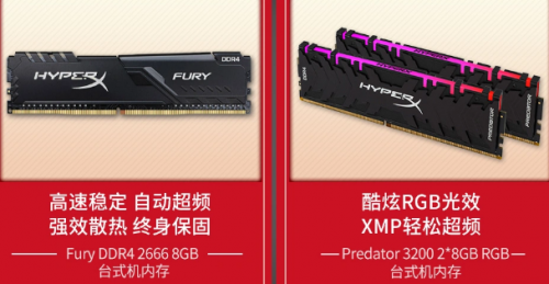 如果自己的电脑到了升级换代的时候,那么金士顿的产品是必不可少的,电脑运行不流畅,加条内存即可,HyperX FURY DDR4雷电系列骇客神条就是最经济的选择,尤其是DDR4 2666 8GB规格,京东热卖型号之一,出色的品质,自动超频,即插即用,是游戏提速、大型软件提速的不二之选;至于高端内存,特别是要打造酷炫RGB主机的玩家要注意,内存首选一定是HyperX Predator 掠食者RGB DDR4内存3200 2x8GB套条,高品质内存颗粒,铝制高效散热片,RGB动态光效,红外同步技术,XMP超频技术等等,一旦拥有夫复何求?