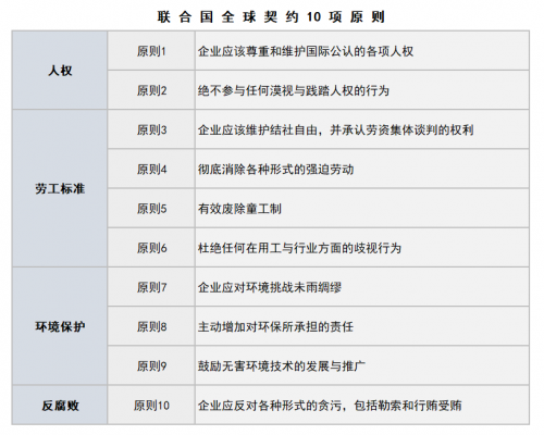 联合国全球契约是企业承诺在运营和战略中遵守人权、劳工标准、环境保护和反腐败四个领域十项原则的战略政策倡议,以推动可持续发展和包容性的全球经济,为人、社区和市场带来长久利益。