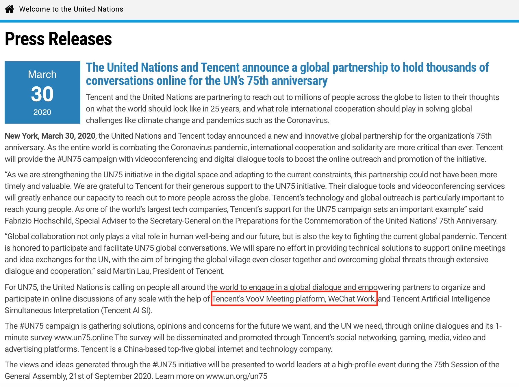 3月30日,联合国在纽约总部宣布腾讯公司成为全球合作伙伴,为联合国成立75周年提供全面技术方案,其中腾讯会议、企业微信将为这场有史以来最大规模的全球对话提供远程会议服务,在线举办数千场会议活动。