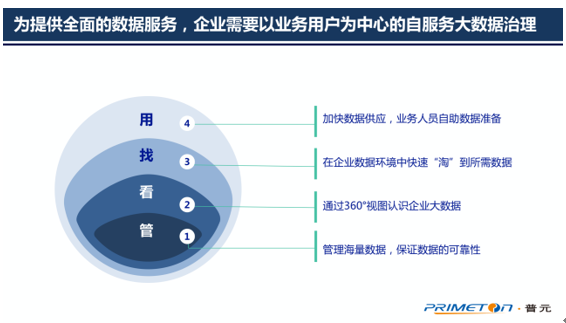 普元自服务大数据治理平台通过提供数据“管、看、找、用”四大能力,帮助企业解决数据不可知、数据不可控、数据不可取、数据不可联数据难题,实现面向数据全生命周期的自动化大数据治理,并且为金融、航空、能源、政府、电信、制造等各行业提供自动化的大数据治理方案。其中,“管”是指管理海量数据,保证数据的可靠性;“看”是指通过360°视图,多角度展示企业大数据;“找”是指以业务需求为起点,自助查找相关数据;“用”是指减轻IT人员负担,业务人员自助准备数据。