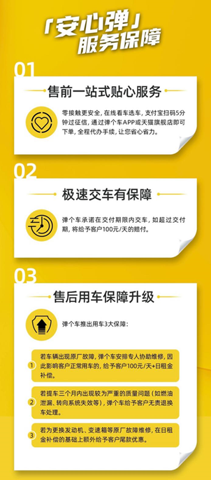 弹个车平台除了汽车质量很好之外,服务水平也在同行之上,在这次疫情期间特地推出“安心弹”服务,主要内容为:如果汽车在售卖出去之后,被发现出现了非人为损坏的原厂损坏,弹个车公司会派出专人进行检查维修如果影响到了顾客的日常生活,弹个车还会按照每天100元的标准进行赔偿;如果检查发现需要更换发动机等大件零件,那么在每日100元的基础上弹个车还会减免汽车尾款的费用;如果在提车3个月之内出现了很大的质量问题,那么公司会统一为客户办理无条件退换的服务。