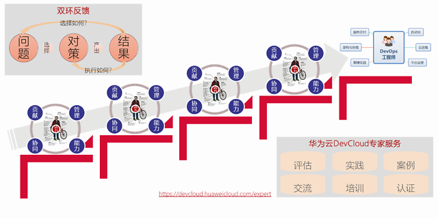 此外,以DevOps工程师能力模型作为指引个人能力提升的目标,基于开发者个人效率提升框架,持续获取双环反馈,并利用华为云DevCloud专家服务所提供的各项服务,切实落地改进。