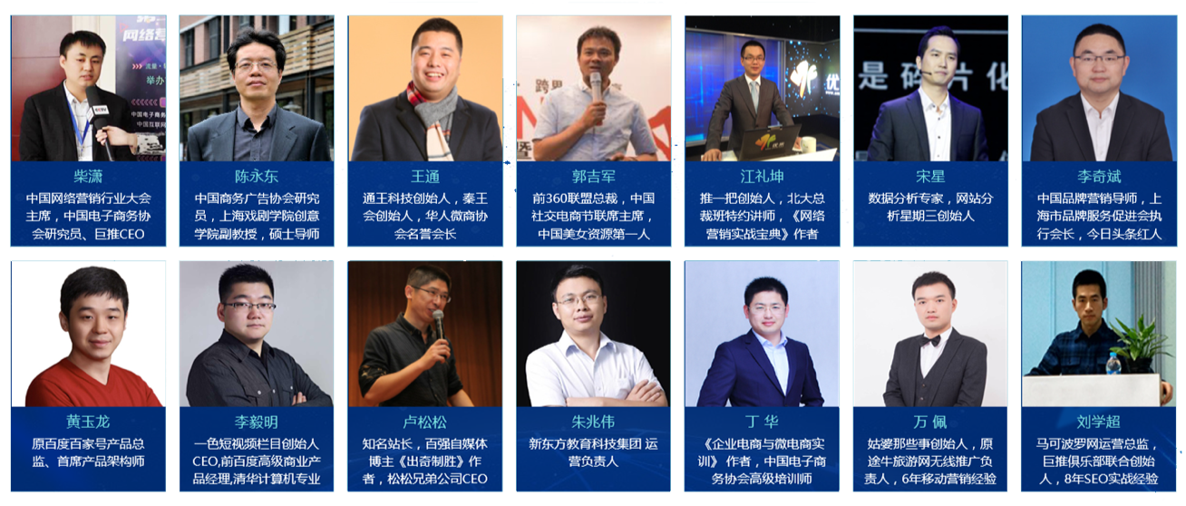 本届中国网络营销行业大会组委会考虑到不同参会者的需要,从营销、推广、运营、SEO、搜索营销、新媒体营销、微商、短视频营销、社群营销、自媒体营销等多个领域着手,邀请了众多行业专家、营销大咖、民间高手和实战派从业者。嘉宾如下: