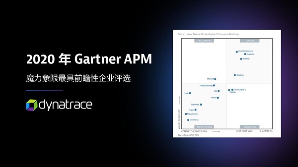 Dynatrace在Gartner 于4月22日发布的2020年应用性能监测魔力象限中,被评为“领导者”和“最具前瞻性企业”。这已经是Dynatrace凭借其“前瞻性”和“执行能力”连续第十次入选领导者象限。