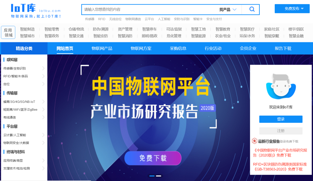 电脑浏览器访问IoT库官网www.iotku.com, 点击首页《中国物联网平台产业市场研究报告(2020版)》,注册登录后即可限时免费下载。