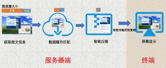 在获取到即将传输的屏幕图像信息时,通过HEDC缓存匹配的对比分析,找出当前画面和历史缓存画面相同的部分,只需传输不相同的画面信息。而这些未匹配的数据,同样通过HEDC的智能识别技术,对视频和文本等信息进行智能分类处理与压缩:如对于视频信息,只会对视频画面中发生变化的区域进行压缩,然后通过桌面云终端解码播放,有效减少数据流量;而在文本信息压缩方面,通过对算法进行深度优化,压缩效果相比传统桌面云,流量削减30%以上。