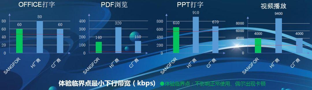 深信服桌面云基于创新的HEDC技术,大幅降低了视频、PPT播放之类的场景流量,在8Mbps带宽下,能保障1080P视频的流畅高清播放,即使在4Mbps的带宽下,也能进行流畅的视频观看。对于普通办公场景,更是在平均600kbps的带宽下,就可以提供与物理PC一致的办公体验。