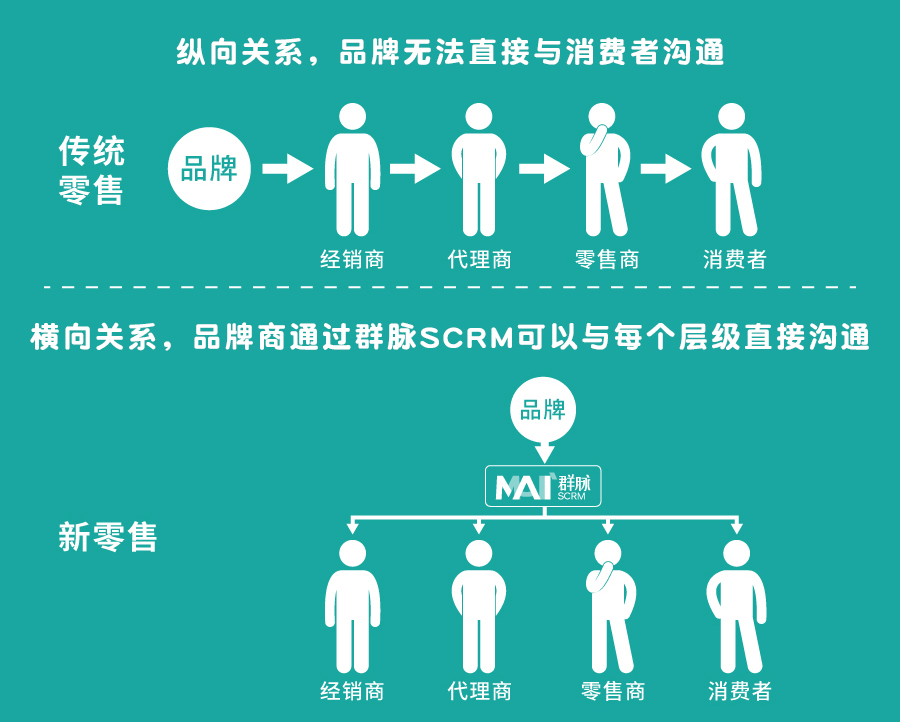 SCRM的一个重点特点便是能够打破中间环节,这也为变纵为横提供了可能,让企业能够打破与消费者之间的层层架构,实现企业与渠道商、门店以及最终消费者的直接连接,从而把握真实客户需求,真正做到客户运营。