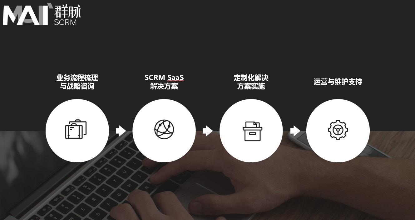 群脉的服务过程主要分为四步:业务流程梳理与战略咨询、群脉SCRM SaaS解决方案、定制化解决方案实施、运营与维护支持。这与SaaS的服务方式普遍不同。