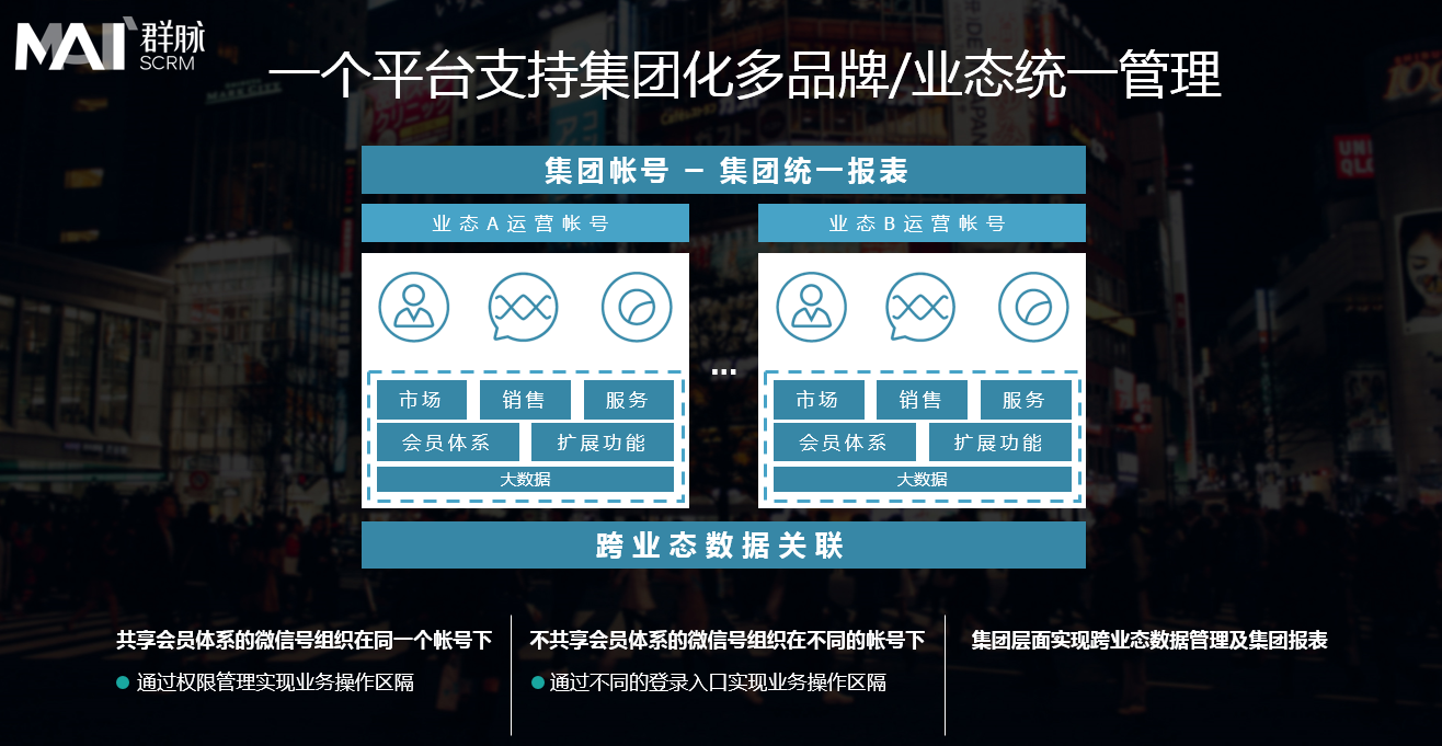 群脉SCRM的定位是面向行业领导者的用户生态数字化运营平台,行业领导者意味着其客户群体为行业第一层级的企业,用户生态数字化运营平台则有两层含义,一是企业全渠道连接用户、持续互动的连接器,二是连接数据,实现数据变现的平台。
