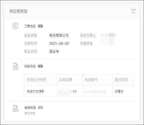 合同审批中,签约相对方的资信信息自动嵌入到合同审批的协同区。在审批过程中,可直观展现签约相对方的资信信息,防范交易风险。