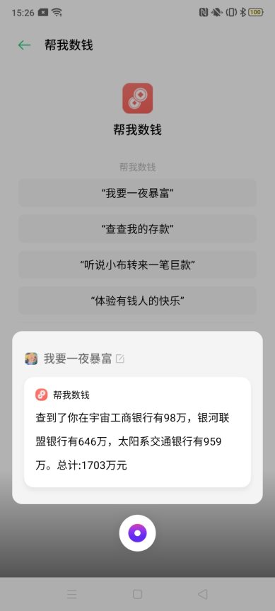 听说小布转来一笔巨款,只想让你感受有钱人的快乐就是如此朴实无华。用户只需对小布说一句“我要一夜暴富”,小布帮你实现梦想,体验有钱人的快乐,圆你暴富梦。