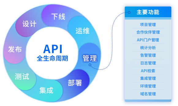 此次数聚蜂巢API中台发布,对API全生命周期管理功能进行了多方位升级,将API生产者、API管理者、API消费者三个角色贯穿起来,覆盖API的设计、发布、运维等8个阶段(如下图),并从API门户管理、项目管理、合作伙伴管理等多维度丰富了服务功能,实现API产品化的价值提升。