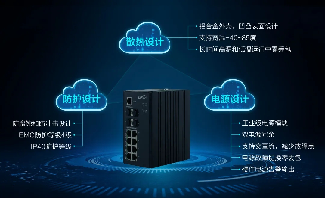 迪普科技在进行工业交换机相关产品规划时,为满足产品能够在各种恶劣、严苛环境下持续稳定的运行,在产品防护、散热、电源等多方面都进行了专业化设计。