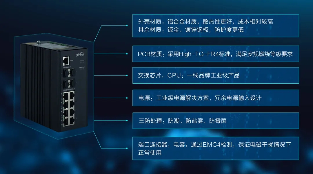 优质的产品在设计上需要下充足的功夫,迪普科技在工业交换机所有元器件选型上都与最先进工业级解决方案提供商进行充分沟通,确保产品使用的都是最优组合进行产品硬件组装。