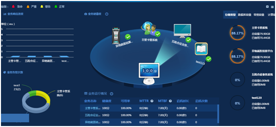 从业务角度看,构建业务应用分析模型,对各业务系统进行横向对比分析,包括健康度、繁忙度、可用性、宕机次数、宕机时长等,准确衡量业务系统的健康水平差异。图形可视化呈现用户、业务和应用系统的相互关联关系,一方面掌握应用系统异常对业务、用户的影响和威胁,另一方面实现IT与业务交互,将IT对业务的支撑价值完整体现。
