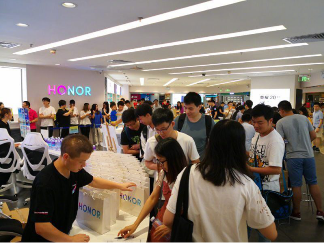 荣耀20系列除了在线上销售成绩斐然,在线下销售也是人气火爆,很多年轻人一早排起长队,第一时间选购荣耀20系列新品手机。