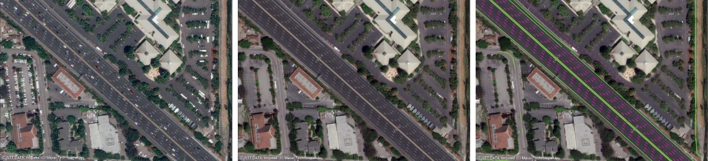 左图为Maxar卫星图像;中图为人工智能去掉图像中汽车,以获得更清晰的提取过程;右图为人工智能从图像中提取的道路标记。