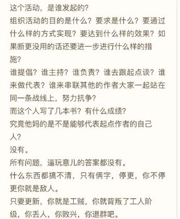 作家“风月”提出质疑:这个活动是谁主持的?谁负责?谁去跟起点谈?这几个组织者写了几本书?有什么成绩?究竟能否代表作者?这些问题都没有答案。