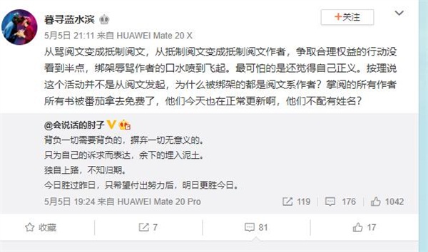 作家“老鹰吃小鸡”在微博上表示:“正常维权,现在弄得跟废青一样。”在阅文新管理层与作家恳谈会结束后,他再次发微博表示:“今天骂作者,明天骂阅文?立场太他么简单了,就是赚更多,阅文改革的好赚的多我就支持,赚的少了,阅文改革就是瞎几把改!”