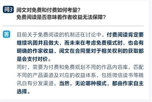 第二,阅文承诺收费模式不改变,付费和免费两大模式怎么选,作者自由选择。