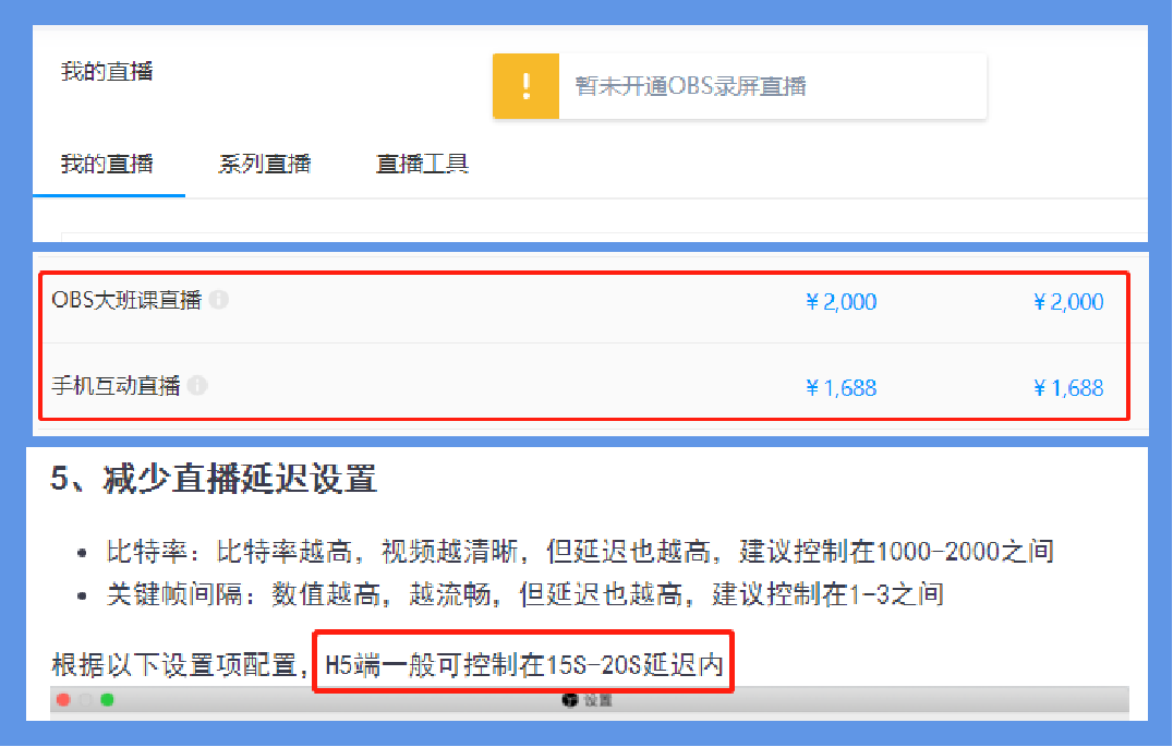 短书还未上线自己的直播助手,电脑端视频直播需要安装配置OBS软件。但在操作过程中发现,无论是电脑视频直播还是和手机直播都需要额外付费开通,无法进行免费体验。根据短书帮助文档中显示,直播延迟在15~20秒之间,处于正常水平。