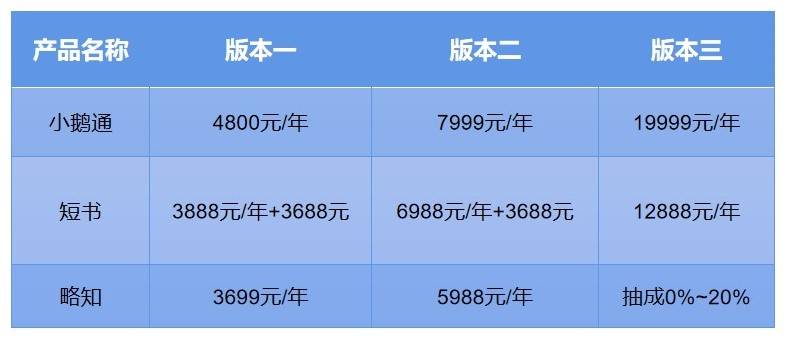 通过官网查询,三个产品的价格从高到低依次为小鹅通>短书>略知,但是短书的直播功能还需额外收费,产品体验和性价比都会大打折扣。总的来看,性价比从高到低依次为略知>小鹅通>短书。另外,略知与同类产品都以收取年费的形式不同,推出了零年费抽成版,免除了资金成本,在产品设计和服务上也更加人性化,更适合中小型教培机构、个人创业者和新手入门使用。