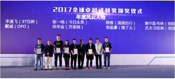 获得2017全球移动互联网卓越成就奖【年度风云人物】荣誉的有:李逸飞(三七互娱)、戴威(ofo)、张一鸣(今日头条)、程维(滴滴出行)、邓华金(齐家网)、张旭豪(饿了么)、谢尔盖·布林(美国)、杰夫·贝佐斯(美国)。