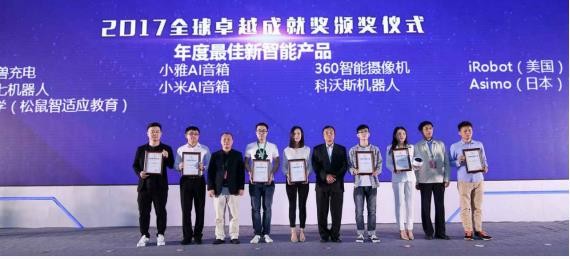 获得2017全球移动互联网卓越成就奖【年度最佳新智能产品】荣誉的有:Asimo(日本)、怪兽充电、乂学(松鼠智适应教育)、小雅AI音箱、360智能摄像机、小米AI音箱、小七机器人、科沃斯机器人、iRobot(美国)。