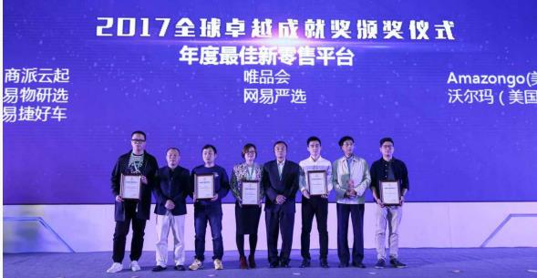 获得2017全球移动互联网卓越成就奖【年度最佳新零售平台】荣誉的有:上海商派云起云计算技术有限公司、易物研选、易捷好车、唯品会、网易严选、AmazonGO(美国)、沃尔玛(美国)。
