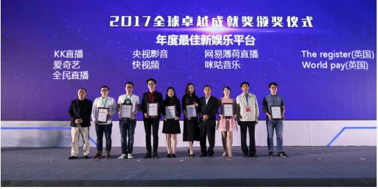 获得2017全球移动互联网卓越成就奖【年度最佳新娱乐平台】荣誉的有:KK直播、快视频、全民直播、网易薄荷直播、央视影音、咪咕音乐、爱奇艺、The register(英国)、World pay(英国)。