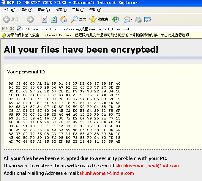 2017年7月19日,国内网友在安全论坛上反馈,自己的服务器中了勒索病毒,所有的文件均被加密,文件后缀名被修改为“skunk”。经瑞星安全专家调查分析发现是感染了Ransom.Globelmoster勒索病毒。